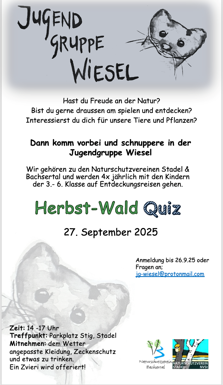 Wir freuen uns sehr, dass wir gemeinsam mit dem Naturschutzverein Stadel neu eine Judengruppe "Wiesel" haben werden. 4x pro Jahr werden wir auf gemeinsame Entdeckungsreise gehen.